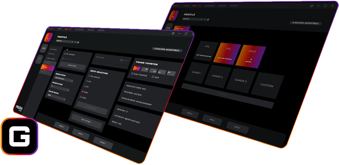 Personalize sua experiência com o G-Menu, o software exclusivo da AOC que centraliza todos os ajustes do monitor em uma plataforma prática e intuitiva.