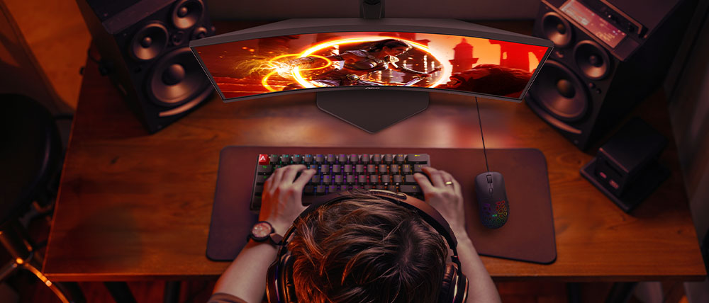 Entre de cabeça no jogo. A curvatura de 1500R preenche seu campo de visão e amplia a profundidade da imagem, colocando você no centro da ação com uma experiência mais envolvente.