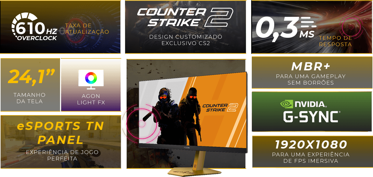 O painel eSports TN de 24,1" entrega nitidez e fidelidade visual para identificar cada detalhe da partida, como aquele pixel crucial antes de abrir a mira. Com tempo de resposta MPRT de 0,3ms, os movimentos se mantêm fluidos mesmo nas trocas mais intensas, garantindo precisão na hora certa para reagir como um verdadeiro profissional no CS2.