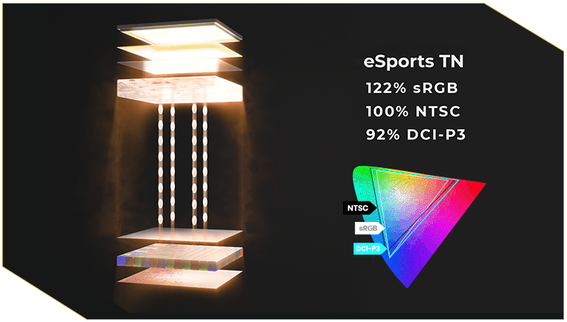 Com impressionantes 610Hz, o novo painel eSports TN foi projetado para entregar performance máxima e latência ultrabaixa, sem deixar de lado a qualidade visual. Este painel redefine o padrão dos painéis TN, com 122% de cobertura da gama de cores sRGB, 100% NTSC e 92% DCI-P3, oferecendo precisão de cor até nos detalhes mais sutis das jogadas.