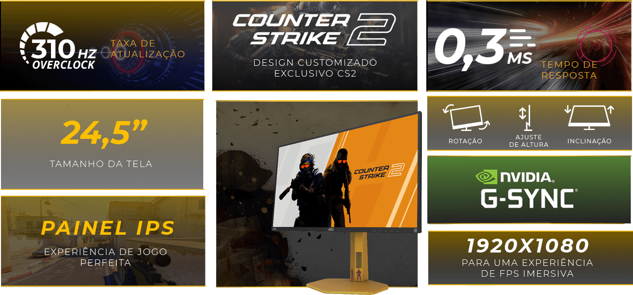 Com painel IPS de 24,5", este monitor entrega imagens nítidas e cores fiéis, ideais para quem não pode errar o timing de um peek. A taxa de atualização de 310Hz combinada com o tempo de resposta de 0,3ms MPRT garante movimentos suaves e reações instantâneas, perfeitos para aquele spray control no bombsite.