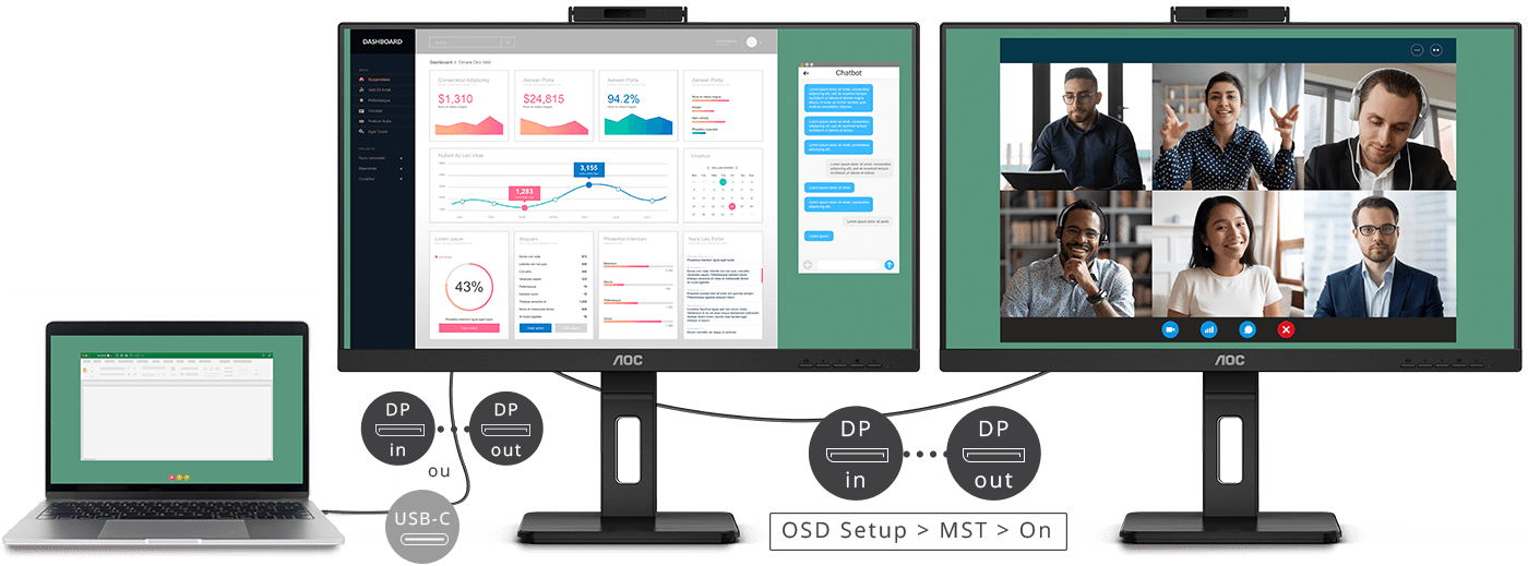 de qualidade para teleconferências perfeitas, eliminando qualquer necessidade de alto-falantes externos.Uma das principais características do Monitor 24P3CW é a tecnologia Daisy Chain, também conhecida como MST (Multi-Stream Transport). Ela permite o uso de até 3 monitores em cadeia, eliminando a necessidade de vários cabos de vídeo conectados ao mesmo PC.