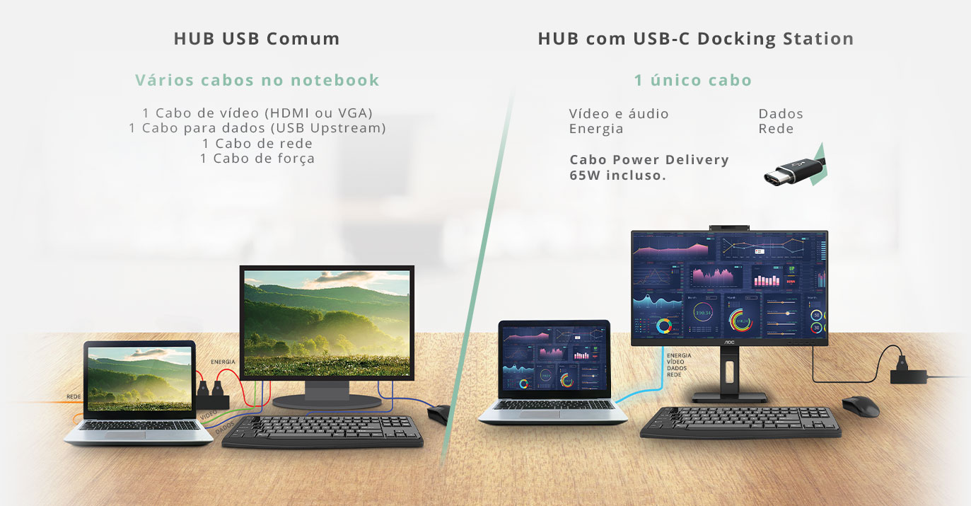 da mesa. Por este único cabo, é possível transmitir todos os seus dados, áudio, vídeo, rede e até energia, através do Power Delivery de 65W, que possibilita carregar o seu notebook com mais velocidade.A funcionalidade Screen + oferece recursos avançados de divisão de tela, permitindo que você maximize a sua produtividade e realize várias tarefas ao mesmo tempo.