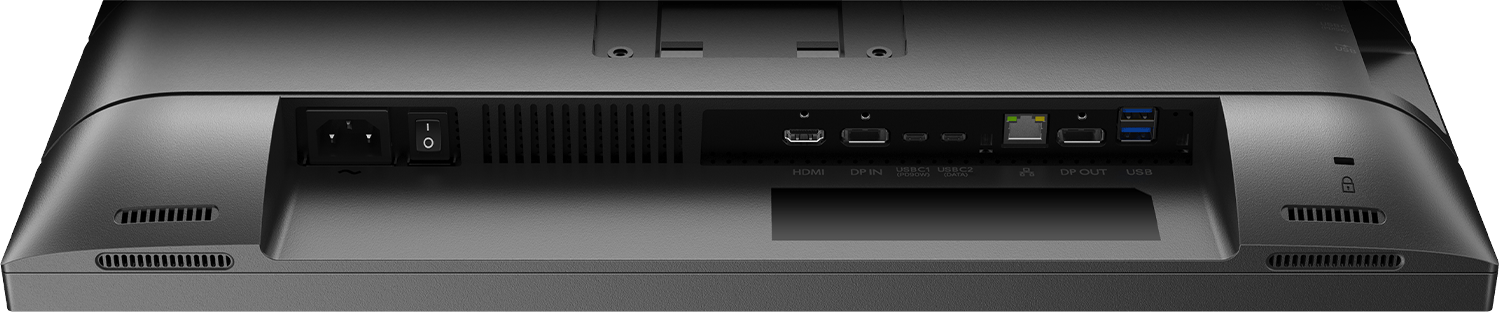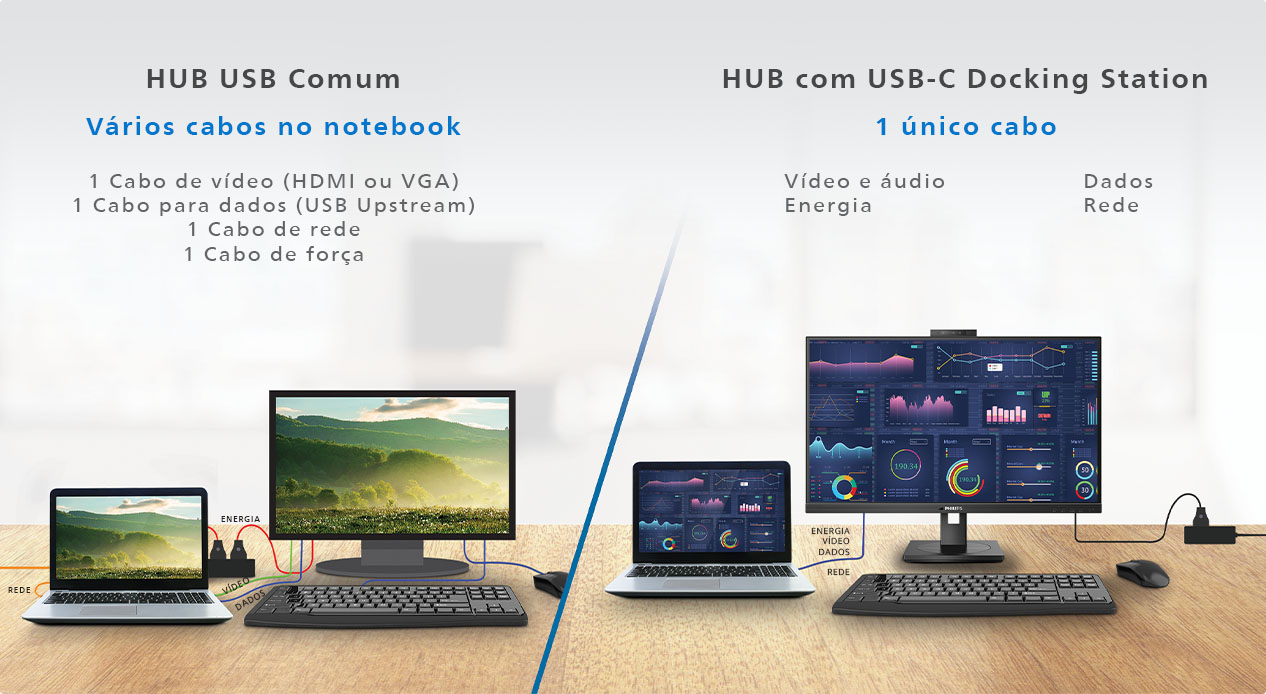 Com um único cabo USB-C, é possível realizar diversas conexões no monitor, incluindo rede, saída de vídeo em alta resolução e até navegação na internet. O USB-C com Power Delivery permite o carregamento do notebook diretamente no monitor, e a conexão RJ45 oferece uma conexão rápida e segura, quando necessário.